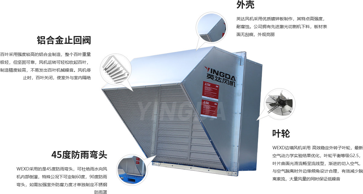 WEXD采用的是45度防雨彎頭,可杜絕雨水向風機內(nèi)部倒灌,特殊公況下可定制60度,90度防雨彎頭,如需加強室外防腐力度才單獨制定不銹鋼防雨罩。