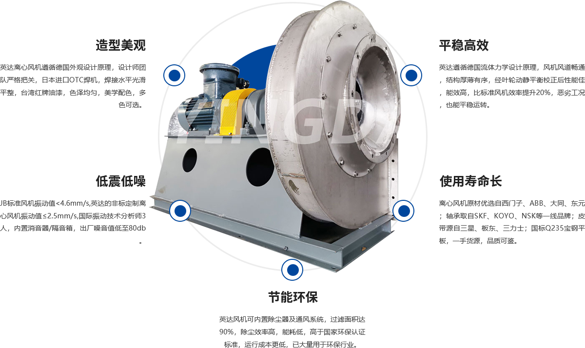 高壓離心通風機廣泛用于環(huán)保行業(yè)、通風送風、粉塵送排風行業(yè)、工業(yè)爐行業(yè)等等等各個領(lǐng)域,是工農(nóng)業(yè)生產(chǎn)中主要耗能設(shè)備之一。離心式通風機是除塵通風系統(tǒng)中四大件之一, 是一種比較精密的運轉(zhuǎn)機械,依靠葉輪的轉(zhuǎn)動在風機內(nèi)部形成負壓,將外界氣體吸入并經(jīng)葉輪流道和蝸殼排出風機。 離心式通風機主要由機殼、 葉輪、 機軸、 集流器、 排氣口、 軸承箱體、聯(lián)軸器、 皮帶輪及底座等部件組成。