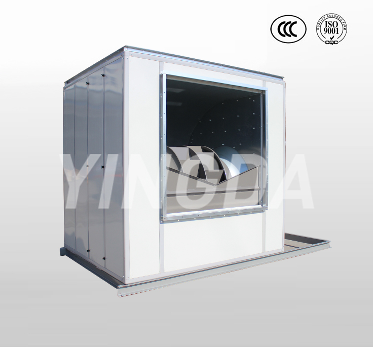 1.1.HTFC-V型柜式離心風機是一種葉片為后傾式箱形離心風機,產(chǎn)品由低噪聲后傾葉片式離心風機、電機、軸承、傳動件、消聲型箱體等組成。根據(jù)安裝位置的不同,提供12種不同的角度的進出風口位置,以滿足用戶不同的安裝需要。根據(jù)消防與通風的不同要求分A式和B式兩種類型,A式電機裝在箱體外,用于消防排煙,并經(jīng)國家消防裝備監(jiān)督質(zhì)量檢驗中心按GA211-2009《消防排煙風機耐高溫試驗方法》進行耐高溫試驗,能在280℃高溫條件下連續(xù)運行60分鐘以上;B式電機裝在箱體內(nèi),用于通風換氣。