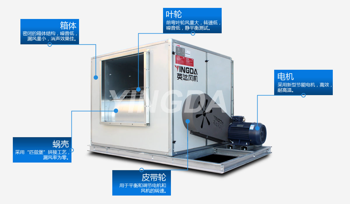 英達風(fēng)機蝸殼采用流線型雙進風(fēng)結(jié)構(gòu),“匹茲堡”拼接工藝,漏風(fēng)率為零;雙側(cè)板一次成型,精度高,減小裝配后尺寸誤差;葉片一次沖壓 成型,專門夾具確保葉片安裝精確定位。