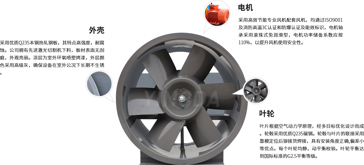 英達(dá)風(fēng)機(jī)采用生產(chǎn)電機(jī)生產(chǎn)設(shè)備和檢查手續(xù)齊全的風(fēng)機(jī)專用配套電機(jī),均通過ISO9001及消防高溫3C認(rèn)證和防爆認(rèn)證及能效標(biāo)識(shí)。電機(jī)應(yīng)與風(fēng)機(jī)負(fù)載緊密配合,采用B3安裝結(jié)構(gòu)。電機(jī)防護(hù)等級(jí)為IP54,絕緣等級(jí)F級(jí),溫升等級(jí)B級(jí)。電機(jī)軸承應(yīng)為滾珠式免潤滑型。電機(jī)功率儲(chǔ)備系數(shù)應(yīng)按110%取,以提升風(fēng)機(jī)使用的安全性。
