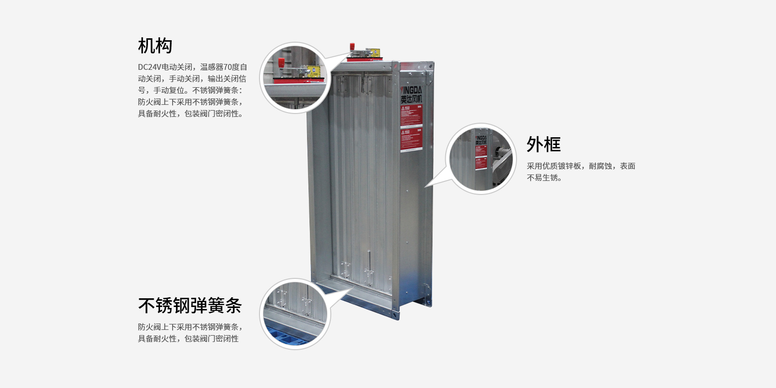 DC24V電動關(guān)閉,溫感器70度自動關(guān)閉,手動關(guān)閉,輸出關(guān)閉信號,手動復(fù)位不銹鋼彈簧條:防火閥上下采用不銹鋼彈簧條,具備耐火性,包裝閥門密閉性。